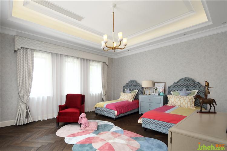 為了給孩子們提供一處充滿童趣的空間,我們挑選了兩張頗有幾何趣味的床體和一張鮮紅的沙發(fā),包括異形地毯的定制,顏色都是由孩子們最喜歡的愛麗絲夢境的主要色彩組成。