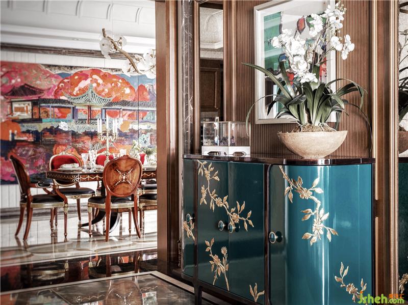 同樣在餐廳的設(shè)計(jì)中,豪宅裝修設(shè)計(jì)也選擇了一幅漆畫,但是另行其道,使用了一些當(dāng)代油畫的畫法,用整體的色彩感和意境美的表達(dá)呈現(xiàn)出當(dāng)代元素,濃烈的色彩感與餐廳的會(huì)客氛圍和食欲遙相呼應(yīng)。精致的燈具在餐廳中的布置也是點(diǎn)睛之筆。