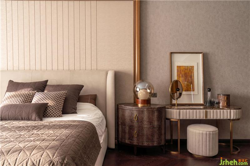 針對(duì)主臥的設(shè)計(jì),豪宅裝修設(shè)計(jì)來了個(gè)反轉(zhuǎn),沒有延續(xù)外面客廳或餐廳的那種濃烈感,女主人希望自己的家整體還是呈現(xiàn)多元化,燈具造型和地毯的幾何紋理讓主臥營造出一種意大利的簡約輕奢風(fēng)。女主人和男主人的生活,有需要每日親手打理、那些淳樸自然的部分,也有科技簡化了日常的部分。傳統(tǒng)繁瑣與現(xiàn)代智能簡便,兩種生活狀態(tài)融合于家中,映襯出夫婦倆各異的性格與其平衡。