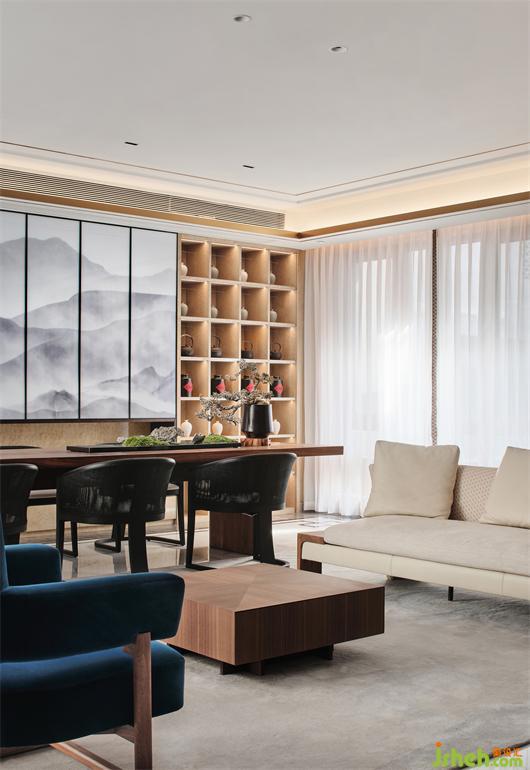 客廳頂部融入中國傳統(tǒng)建筑的房檐元素,一面一角是凝結(jié)的藝術(shù),一尺一寸是生動的風景。整體軸對稱的設(shè)計手法,讓線條如陣列端直,經(jīng)歷四季洗禮,守護一方歲月靜好。