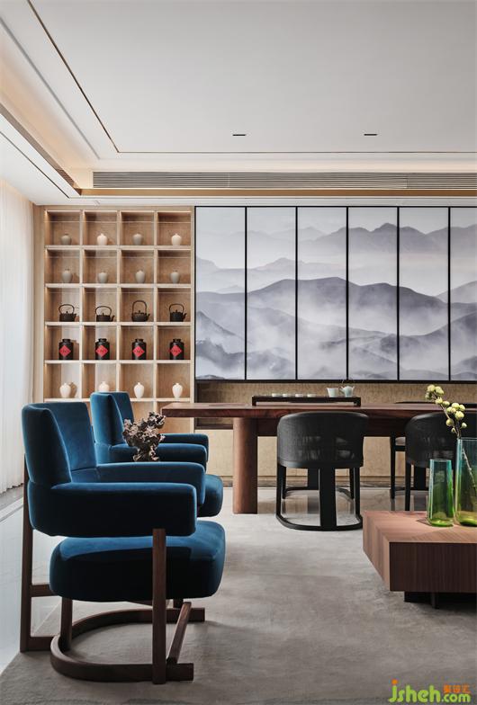 會客區(qū)域的設(shè)計,給人以安定。以經(jīng)典藍白灰為基調(diào),鋪設(shè)大面積樹木年輪紋理地毯,渲染安靜的氛圍。有朋遠來,不亦樂乎,邀至廳堂,客人上坐,主人陪同,清茶點心,談笑風生。
