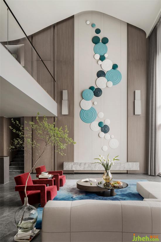 為發(fā)揮建筑的最大價值,確定整體架構(gòu)是重要的一步。延續(xù)房屋本體的層高優(yōu)勢,我們采用波形頂面的挑空設(shè)計,令簡單、明快的造型結(jié)構(gòu)拉近人與空間的距離感。背景墻以3:2比例分割,不別墅設(shè)計同材質(zhì)拼接的處理方式將層高近6.5m的大空間收攏住,不讓挑空格局顯得過于空曠,也令客廳更具視焦點。
