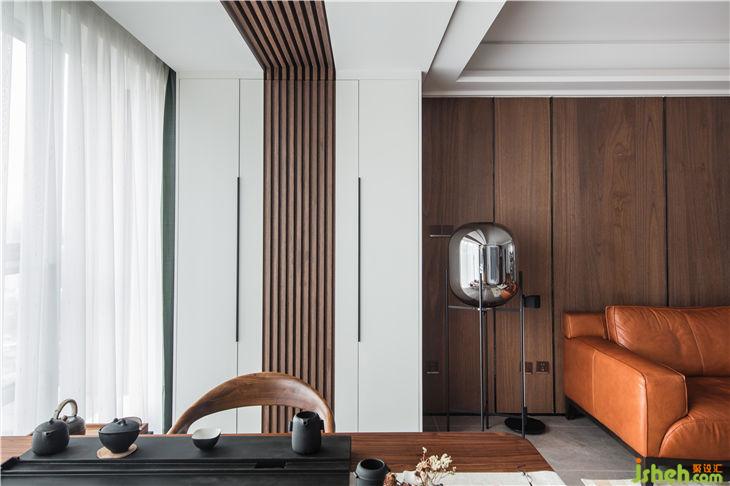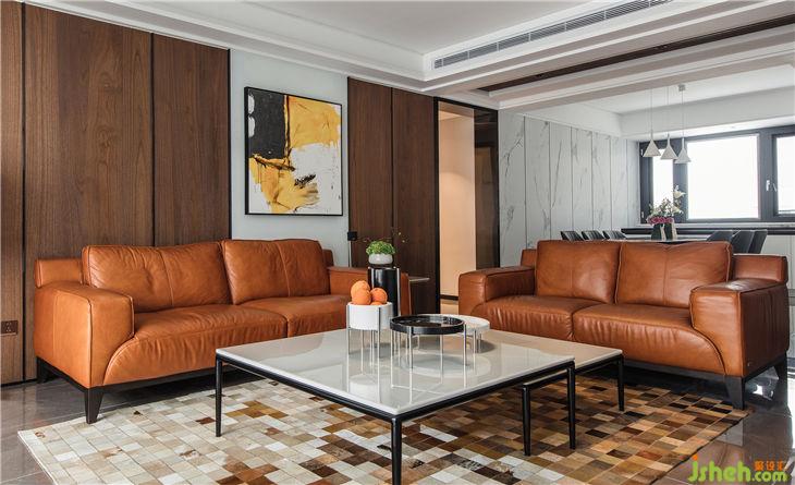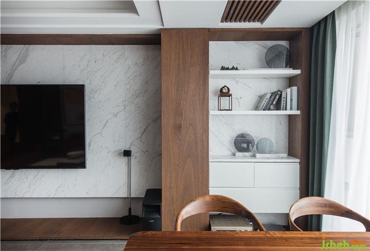 整個空間采用免漆木飾面,它有著傳統(tǒng)木飾面難以比擬的特性,它所見即所得,紋理細膩自然,不用再做漆,紋理色澤可控,也更加的環(huán)保清新。電視背景下的爵士白大理石經(jīng)加工研磨讓無暇的理石表面凸顯質(zhì)感,與深咖色的木紋相互碰撞形成鮮明的對比。
