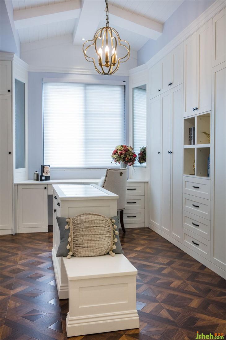 臥室與開放式衣帽間相結(jié)合,不僅通透了整個(gè)空間,且進(jìn)一步提升采光與通風(fēng)。深咖色的地板與亞光白的柜子形體簡約且不失質(zhì)感,帶來的不只是視覺上的素雅輕奢,更有著觸覺上的細(xì)膩柔和、親切、與自然舒適。整體衣柜外加中島儲物格兼具實(shí)用性與美觀性,設(shè)計(jì)師在尺度比例、材質(zhì)工藝的選用上都進(jìn)行了細(xì)致充分的考量,有著干練、和恰如其分的極致感。