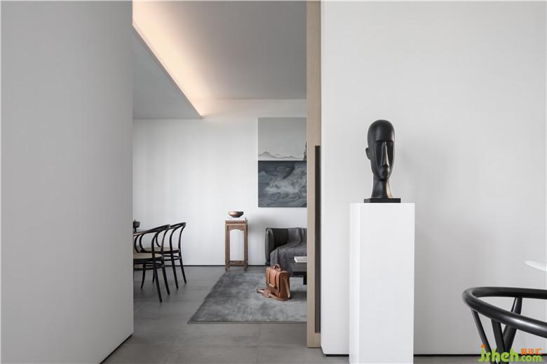 開門見境,玄關(guān)造景,以“樹”塑造空間安靜的氛圍,玻璃磚墻后引介光與影。
