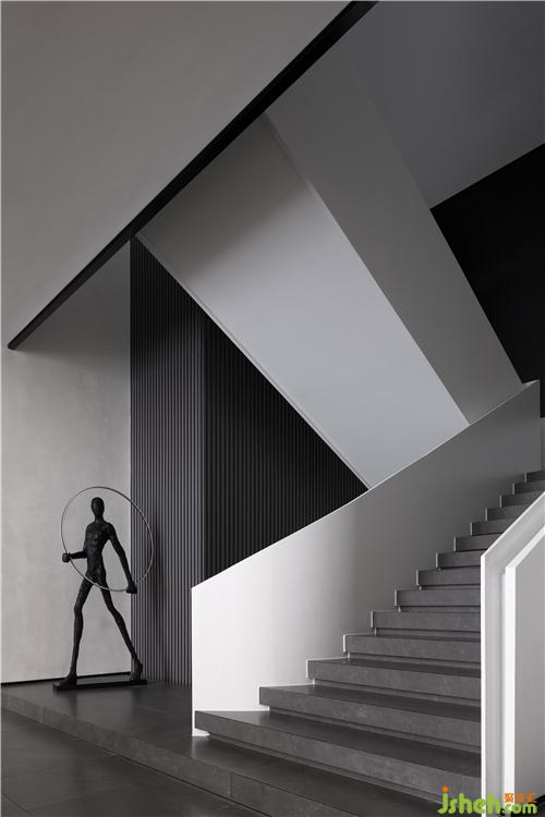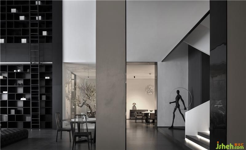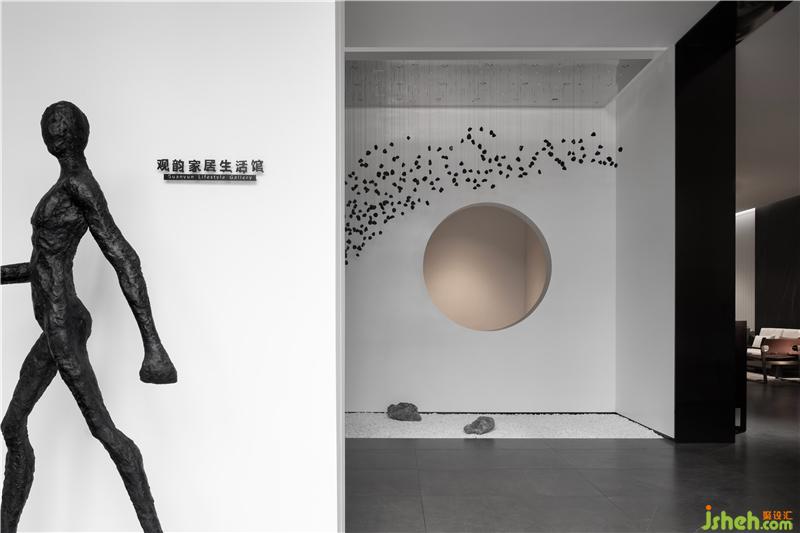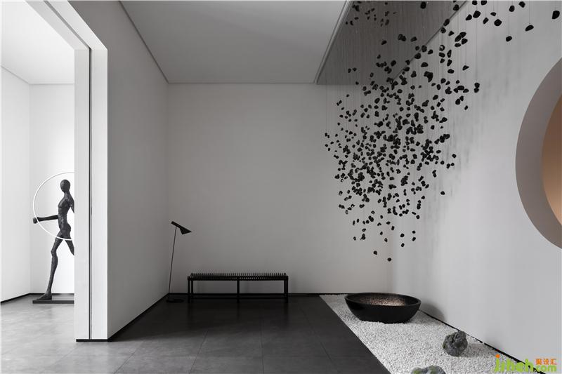 從前廳進(jìn)入玄關(guān),造景與造境,無數(shù)黑色石子從天而降,回歸于一圓盤,寓意“萬物歸一”,順著動線的引導(dǎo),進(jìn)入產(chǎn)品體驗空間后,體驗者藉由移動、視野、猜想,與空間產(chǎn)生互動能量。重新以美學(xué)的展現(xiàn)存在于空間序列之中,構(gòu)建起純粹且順應(yīng)建筑優(yōu)勢的室內(nèi)空間邏輯。