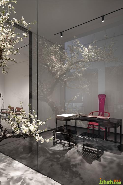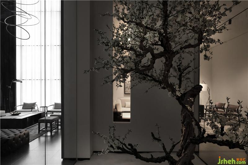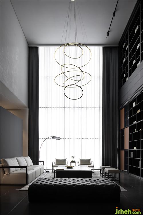 震撼的中庭挑高區(qū)域盈滿廣袤、純凈而安定的靜謐力量,一覽無疑,氣質(zhì)涌現(xiàn),將心放緩下來。上空大型圓形吊燈,高低錯(cuò)落中糅合出空間的比例之美。如雕塑般美感的白色鋼板樓梯連接上去空間,穿插于黑色空間中,用帶有邏輯的切割梳理了異材質(zhì)的沖突、重新搓揉空間的姿態(tài)。傳統(tǒng)濃重的商業(yè)氛圍于此得以弱化,在韻白的世界中打磨至美生活質(zhì)地。舍棄過多的裝飾造型,試圖利用黑白材質(zhì)的「本質(zhì)意象」去體現(xiàn)一個(gè)空間的風(fēng)格及層次。只需身在場域之中,便能體會(huì)其柔軟、強(qiáng)烈、安靜、亦或神秘;材質(zhì)線條于無形中界定了空間,形塑出一個(gè)全新、當(dāng)代的空間想象。