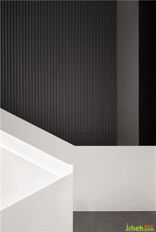 利用網(wǎng)格元素墻隔出相鄰的功能區(qū)間,調(diào)節(jié)漫游動線的心境,另外空間一面黑白林間雪景燈箱畫呈現(xiàn),在空間中不同溫度的感受,保證了簡約空間的視覺一致性。