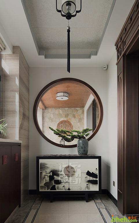 走進(jìn)門廳,素雅的氣息已經(jīng)開始環(huán)繞在周圍。我們將中式園林的設(shè)計(jì)手法引入門廳之中,來往主賓透過圓形窗洞便可看到對(duì)面的景色,移步換景,富有層次。設(shè)計(jì)公司