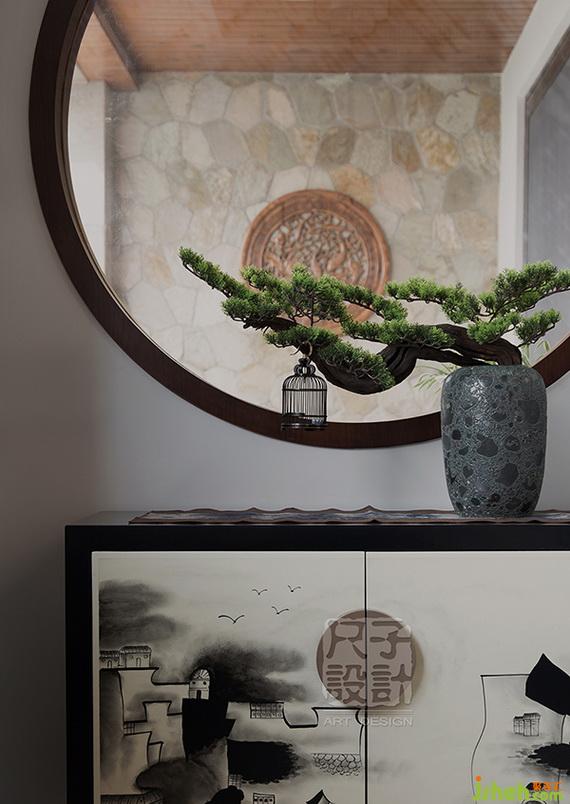 矮柜上羅漢松蔥翠秀雅,更為玄關(guān)帶來蒼勁高潔之感。設(shè)計(jì)公司