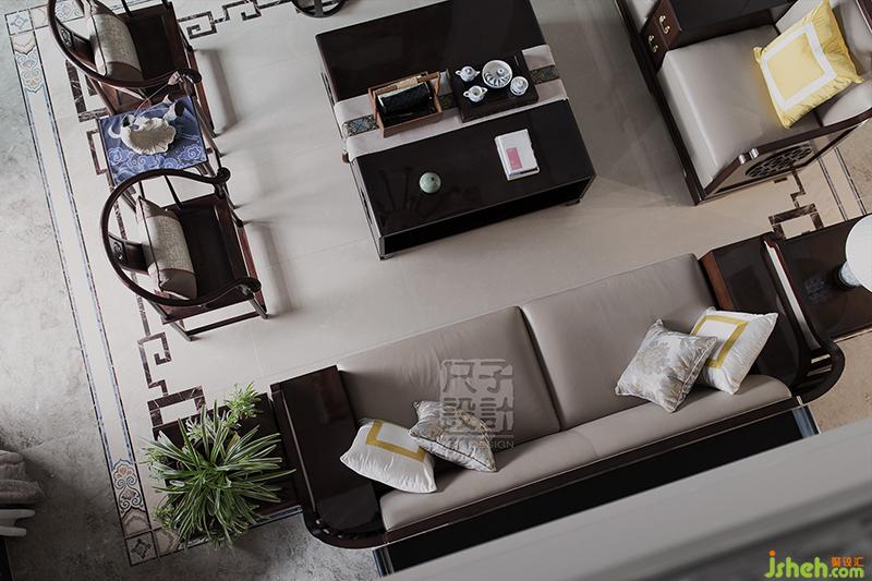 俯視觀之,符合中式美學(xué)的對稱布局平穩(wěn)大氣,將客廳之景盡收眼底。