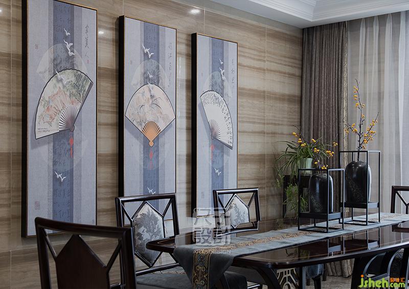 信步走向餐廳,兩邊的木色將人環(huán)繞在其中,鏤空隔斷與雕花矮柜訴說著中式的精彩。