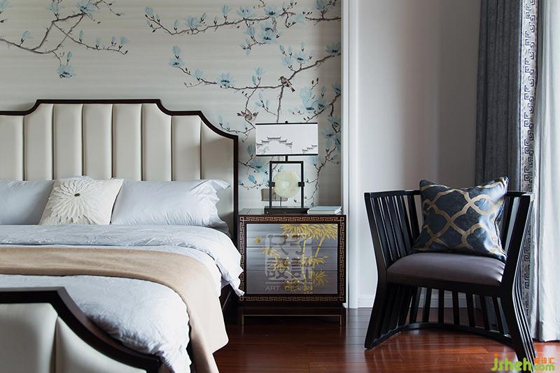 居之然,處之安,典雅的主臥是心靈的休憩之所。背景墻上的花鳥雖是寥寥幾筆卻很傳神,靈動的鳥兒躍然壁上,仿佛下一秒就可在耳邊輕語。