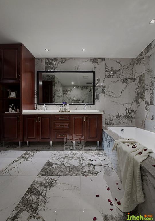 有別于其他空間,主衛(wèi)的選擇的石紋仿佛是遇水暈染開來的幾滴濃墨,接一池熱水,蒸汽騰騰漫開,花紋似有似無別具意境。
