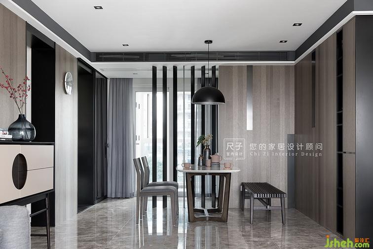 黑色亞光拉絲不銹鋼的框架+木質(zhì)的柜面組成的雙開柜,既是玄關(guān)柜又是餐邊柜,還充當(dāng)了入戶屏風(fēng)的角色,解決了入戶即可見(jiàn)臥室門的問(wèn)題。深圳裝修公司