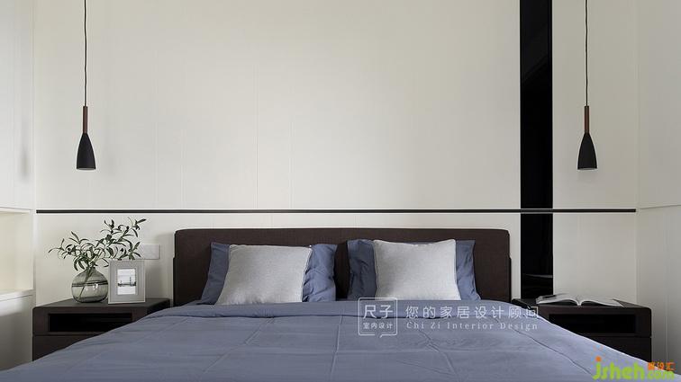 主臥床頭以護墻板跳接黑鏡設計,延續(xù)主人喜愛的黑白時尚。