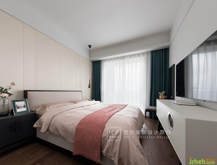 香檳色的硬包床頭與床品搭配實木地板,舒適溫馨;墨綠的窗簾給臥室?guī)沓领o安穩(wěn)之感。