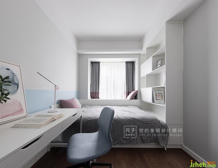 墻面做了墻漆分色處理,高級灰+低純度的藍,文藝又清新;裝飾畫、抱枕以及窗簾色彩與空間主色相呼應,營造溫馨自然的感覺。