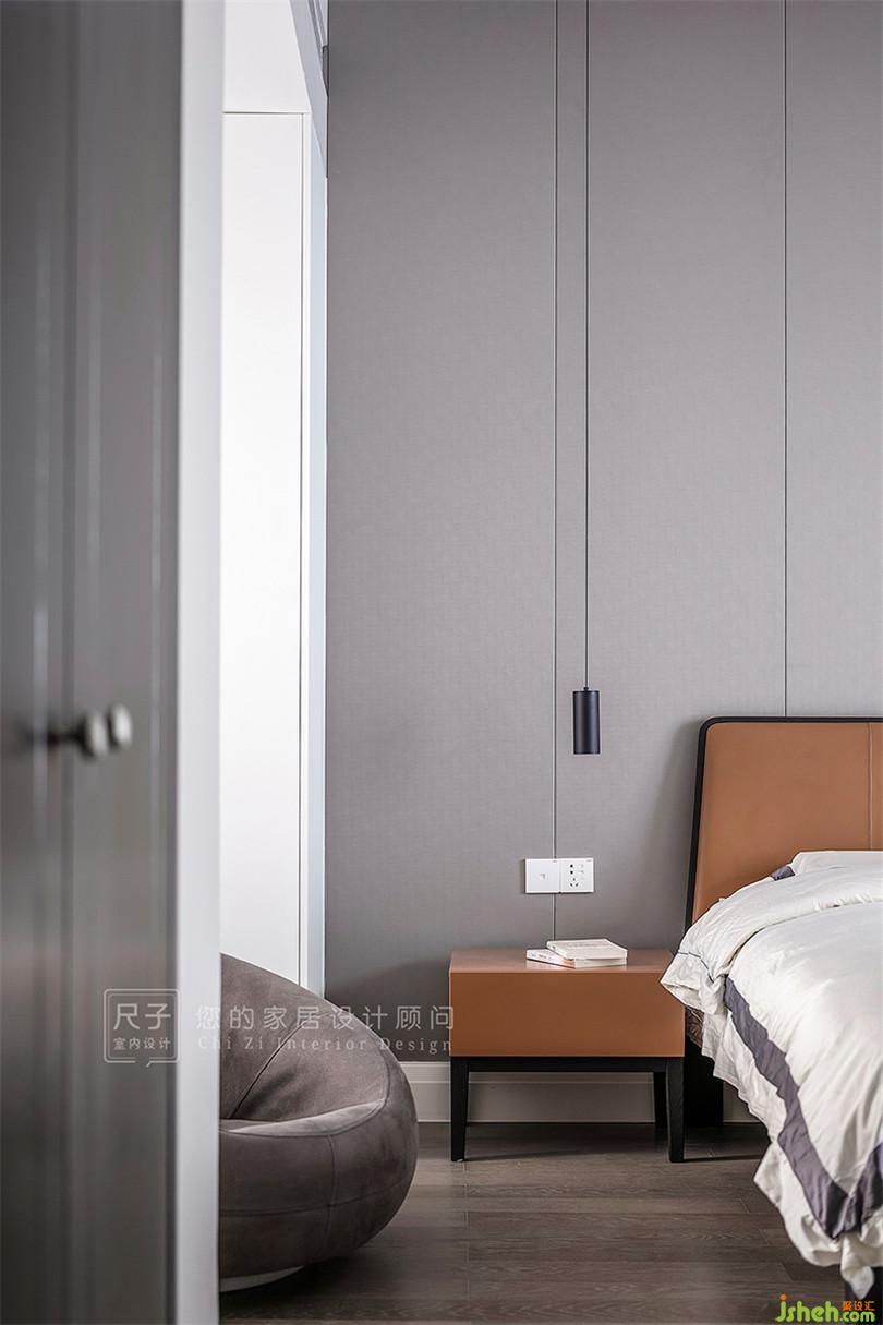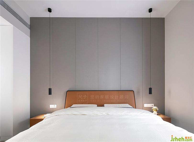 主臥床頭面積較寬,我們以縱向分割的硬包造型來改善視覺表現,同時用垂落的兩盞吊燈營造溫暖的氛圍感。