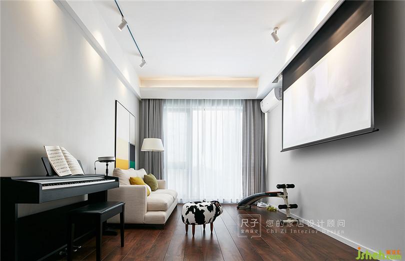 拾階而上,便是開放式的多功能房。這里既是業(yè)主的書房,也是他們的琴室;拉上窗簾,又是一家人理想的影視廳。