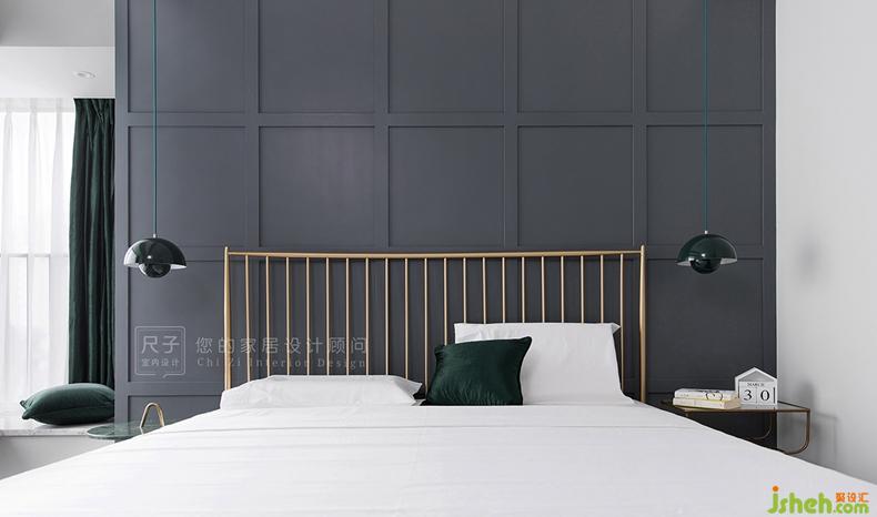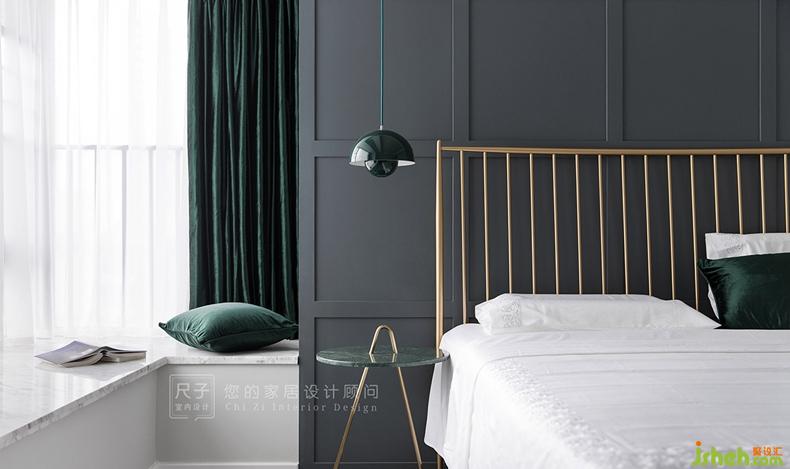 主臥背景墻延續(xù)著客廳的基調(diào),時尚的墨綠軟裝與黃銅色的鐵藝床頭,給空間帶來復古高貴的氣質(zhì)。深圳設(shè)計公司