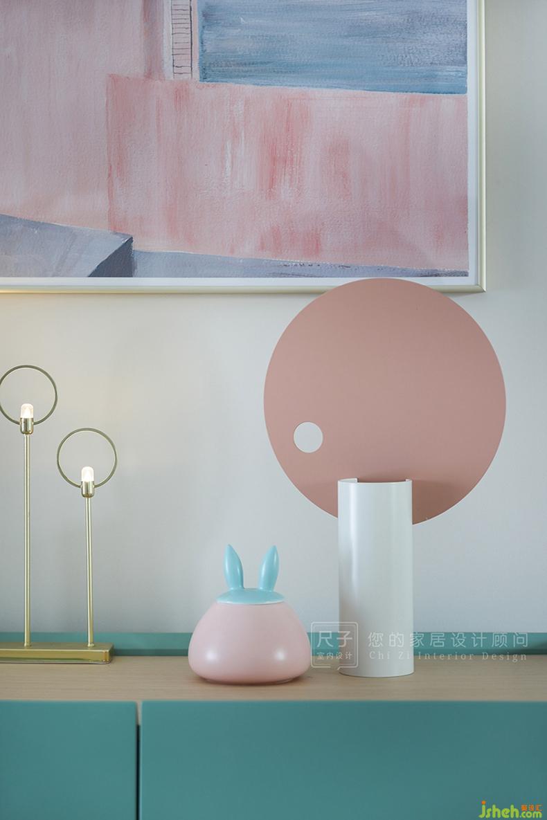 本案例以F小姐喜愛的馬卡龍色系為主色,通過對色彩的巧妙把控,以低飽和度的對比色碰撞,還原F小姐心中:詩意、夢幻、溫暖的家。