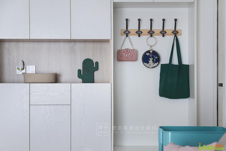 設(shè)計的一大作用便是為生活提供便利。到頂?shù)男P(guān)柜一側(cè)做換鞋凳,進(jìn)門后,順手掛上包包、換鞋,動線流暢;底部空隙還可以放置當(dāng)季常穿的鞋子。