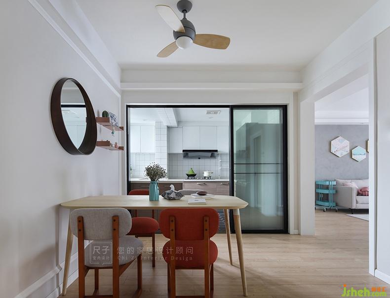 玄關(guān)還是客餐廳的過(guò)渡地帶,右轉(zhuǎn)過(guò)門洞便是這個(gè)家的餐廳區(qū)域。黑框+玻璃的推拉門,除了讓餐廚功能布局分割更加明確,也讓室內(nèi)更顯時(shí)尚敞亮。