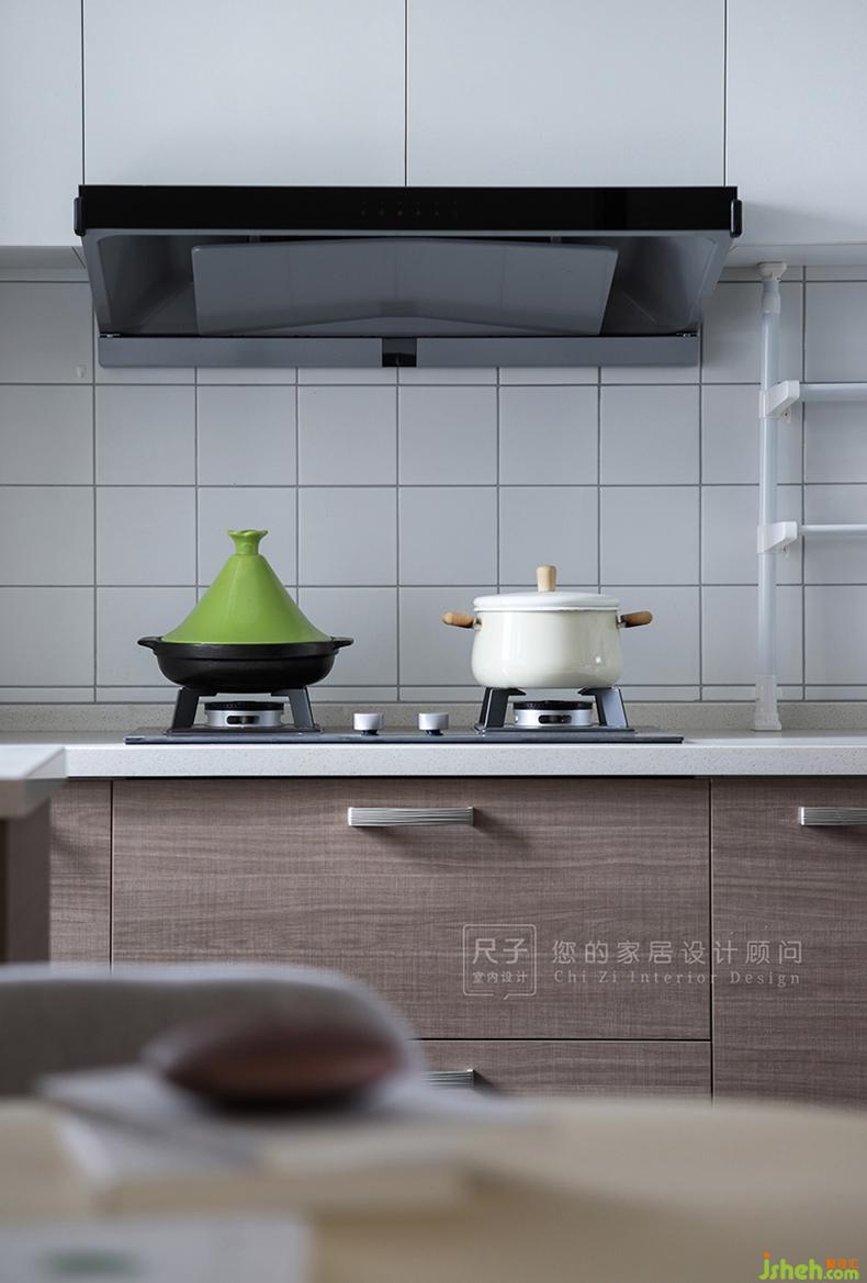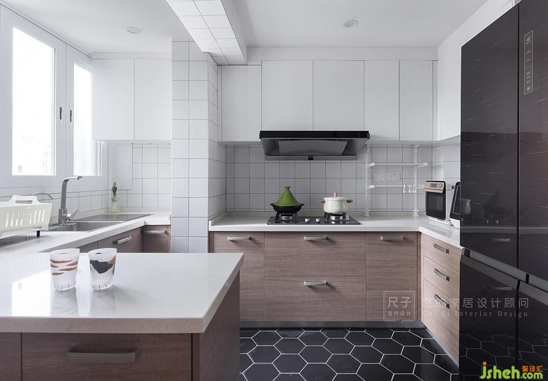 木的溫潤(rùn)與黑白的干練,構(gòu)成了清爽的廚房空間。沿推拉門一側(cè)做小吧臺(tái)設(shè)計(jì),這一塊是實(shí)用的備餐區(qū)。