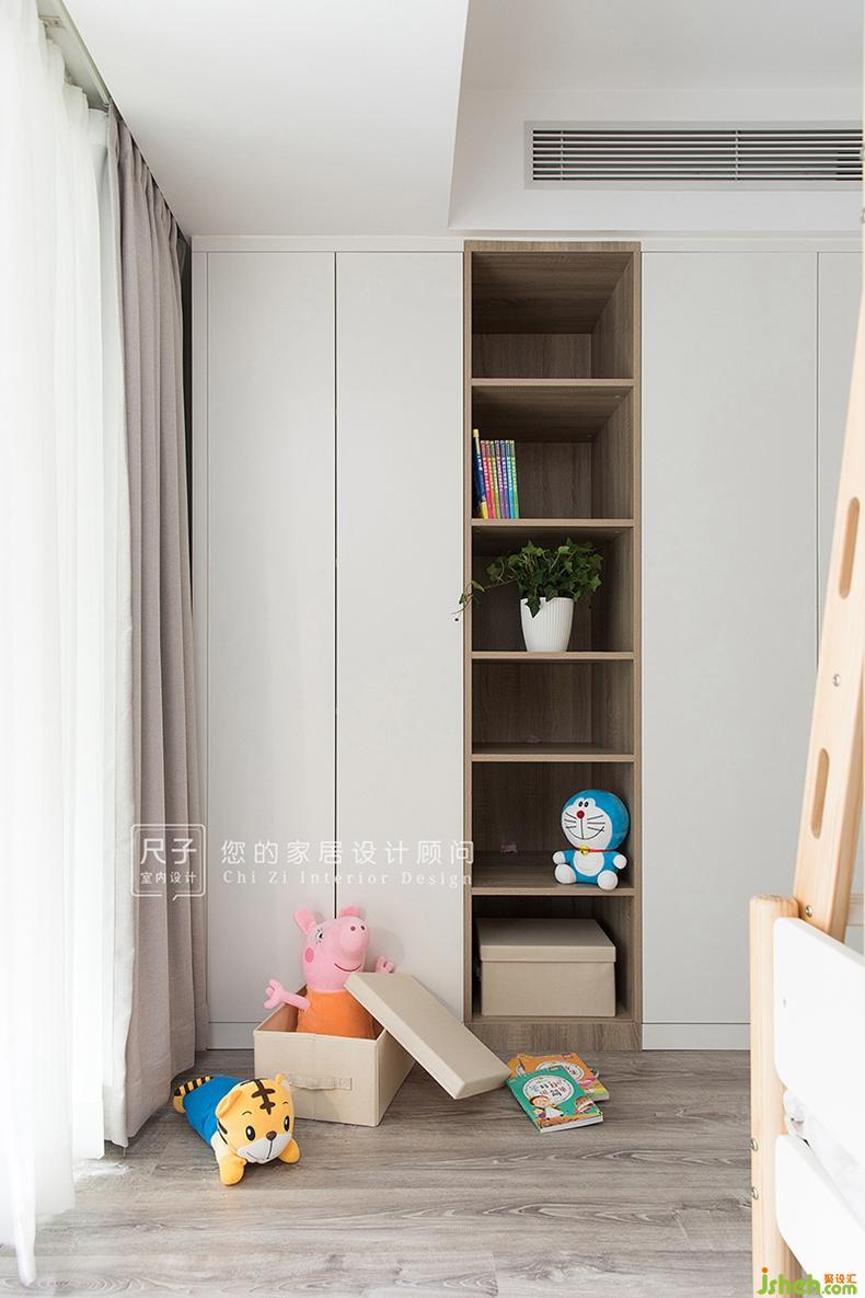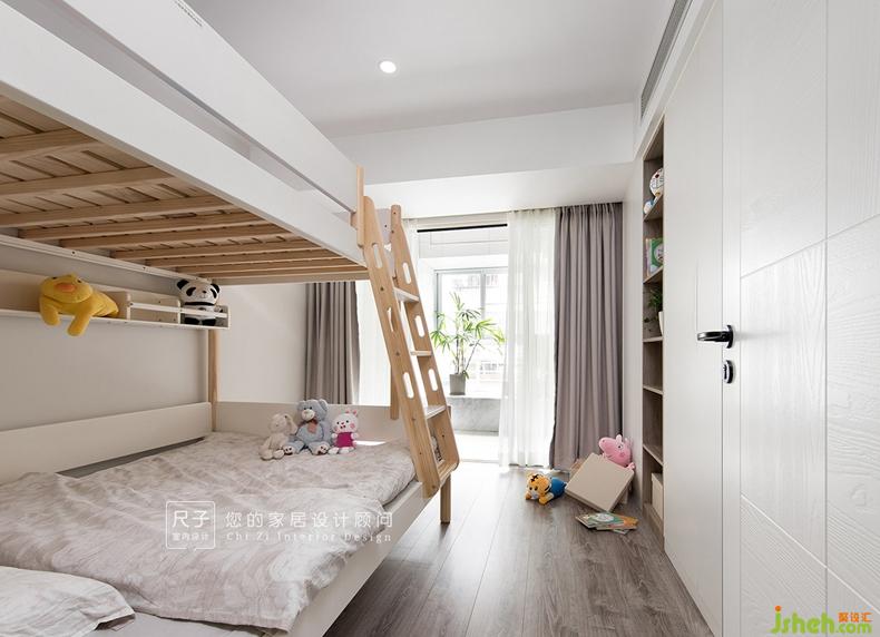 小孩房以上下床設(shè)計實現(xiàn),整體色調(diào)清雅,給孩子營造一個安靜舒適的睡眠空間。