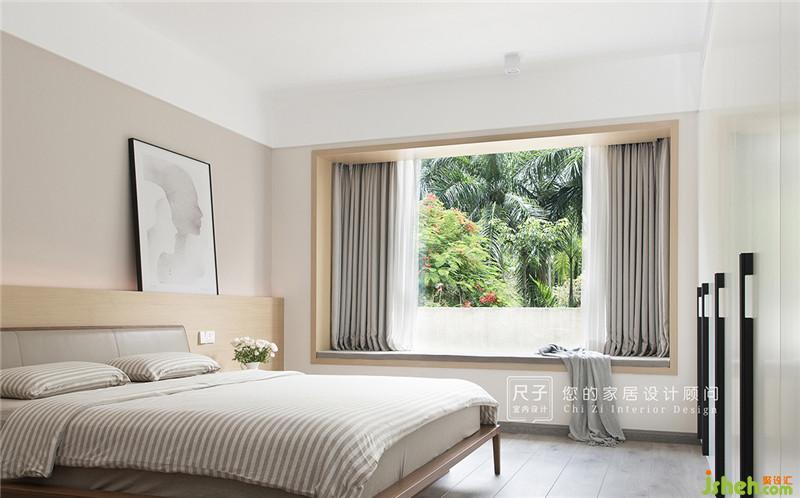 主臥通過飄窗與自然關(guān)聯(lián)、融合,木質(zhì)窗套與床頭背板打造視覺銜接感。