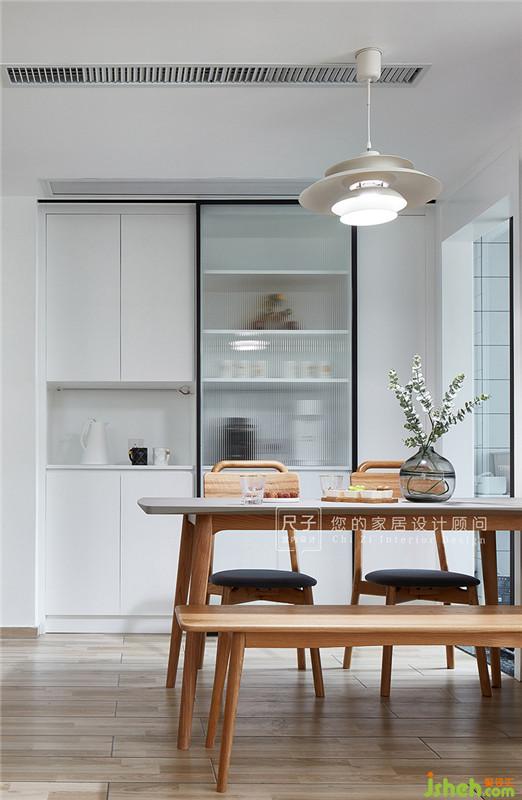 進門左側就是這個家的餐廳區(qū)域,清雅的淺木色餐桌椅營造溫馨的用餐氛圍;餐邊柜長虹玻璃移門給簡單的場景帶來朦朧變化的美感。