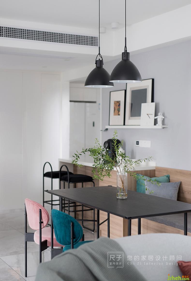 室內(nèi)設(shè)計師將原本比較雞肋的窗臺利用起來做卡座設(shè)計,小吧臺與之連接成為一體,這里頓時有了“深夜食堂”的溫馨。如果足夠細(xì)心,還會發(fā)現(xiàn)吧臺下方隱藏著淺淺的收納柜。