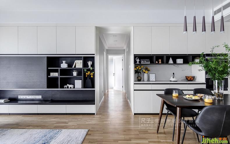 客廳餐廳進(jìn)深不一的柜體在色彩和形體上達(dá)成統(tǒng)一和諧,光線自然而然在不同空間流動。