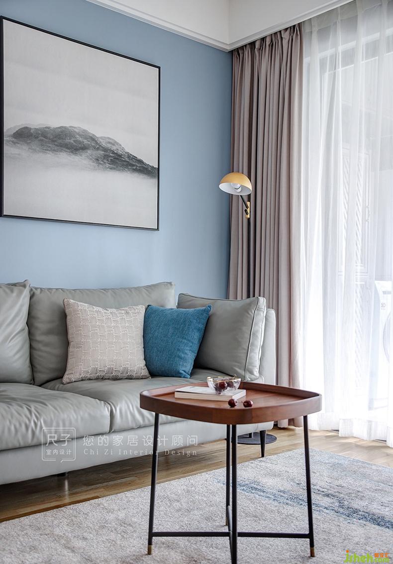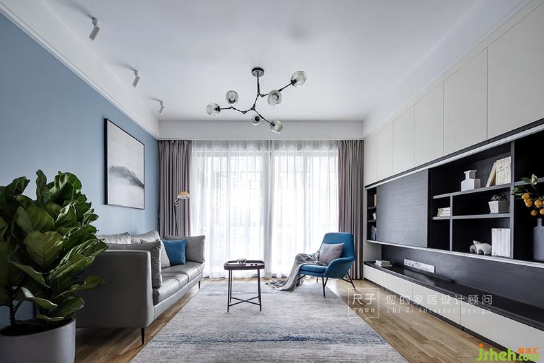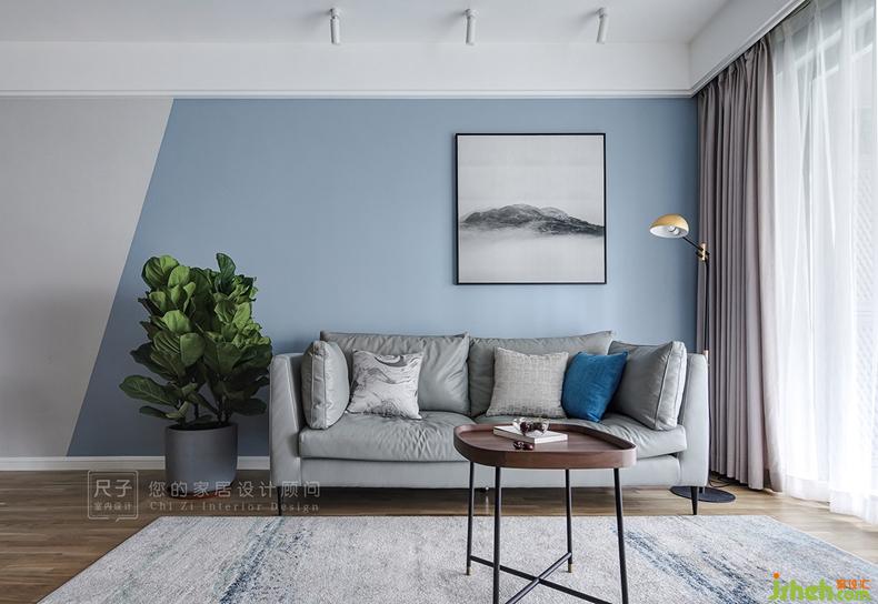 從餐廳延伸過來的墻面過長,如果處理為統(tǒng)一的灰色墻面,難免顯得單調(diào);我們以簡單墻漆分色設(shè)計(jì)將業(yè)主喜愛的藍(lán)色應(yīng)用到客廳;黑白灰的冷靜空間,有了家的溫馨的暖意。