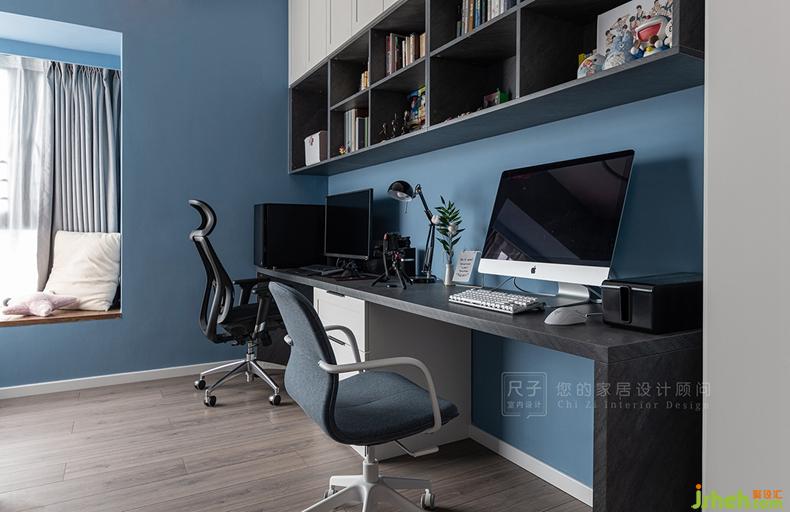 書房以沉穩(wěn)的藍(lán)色作為墻面打底,與一襲自然的木地板承載著空間內(nèi)所有物件,這里是一個可以靜心思考的地方.