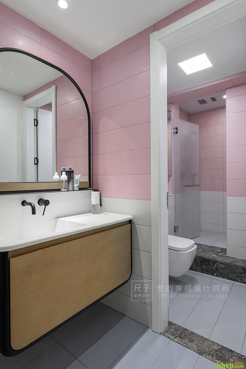 粉白撞色的小方磚讓公衛(wèi)充滿時尚的氣氛,室內設計師犧牲利用率不大的小陽臺,公衛(wèi)多了做淋浴房的空間。