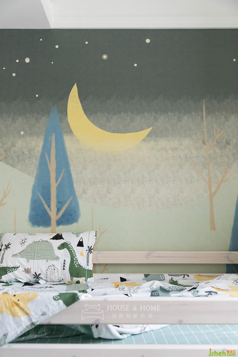 小孩房的布置趣味十足,我們希望孩子的每一場(chǎng)夢(mèng)都能充滿奇妙的童話色彩。右側(cè)灰綠色半墻是帶磁力的白板墻,可供孩子涂寫繪畫。