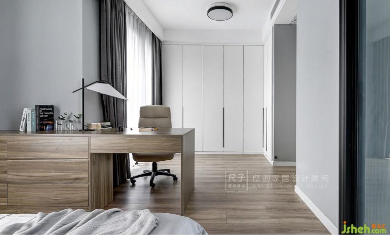 將相鄰臥室打通并入主臥,得到睡眠區(qū)+辦公區(qū)+休閑區(qū)+衣帽間一體,足夠開闊的套間。依墻體做書桌,這一塊是業(yè)主夫妻兩的工作區(qū),靠墻一側還可作為女主人的梳妝臺。