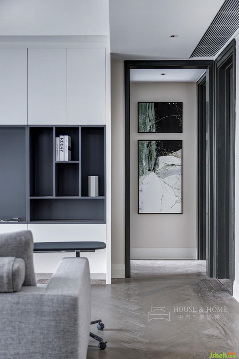 灰調(diào)的空間內(nèi)加入白色,天與地之間有了聯(lián)系,挺拔的線條在視覺(jué)層面起到拉升層高的作用,與吊頂結(jié)合消除梁體帶來(lái)的壓抑感。