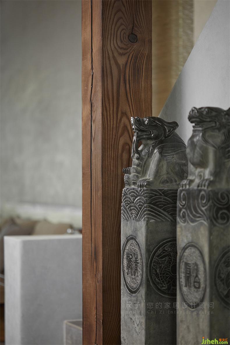 樓梯口擺放了一排拴馬樁,取門庭興旺之意。室內(nèi)設(shè)計(jì)師