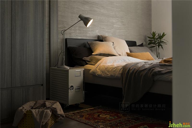 黑白灰、水泥墻營造的冷靜克制氛圍,讓人不由得放慢節(jié)奏去思考;復(fù)古個性的床頭柜與地毯,柔軟舒適的床品抱枕,這些細節(jié)處的軟裝搭配又讓整個家在理性中不乏溫情。