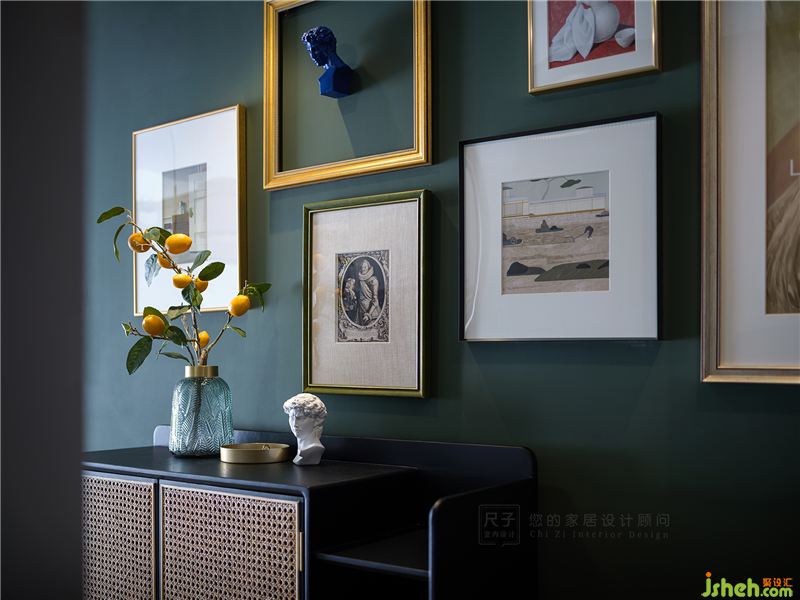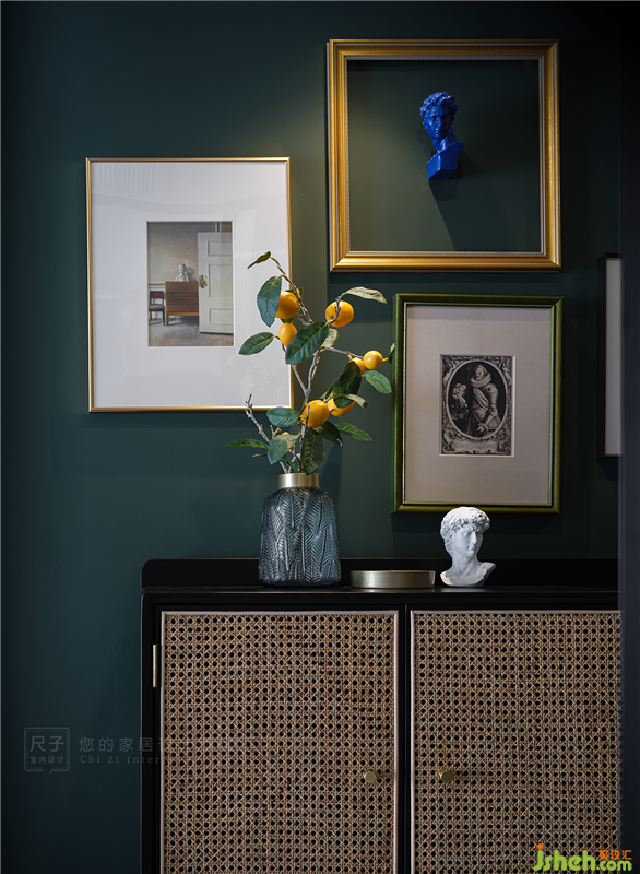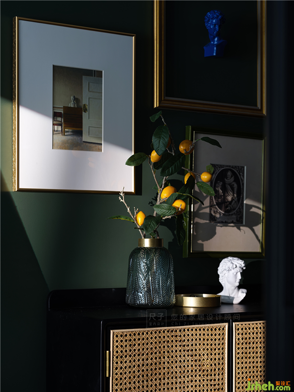 玄關(guān)處的暖色燈光為家居配飾打造出一個獨特的舞臺,松綠花瓶與檸檬果靜立在藤編鞋柜上,與不同色彩的掛畫組合,演繹一場萬種風(fēng)情的戲曲。