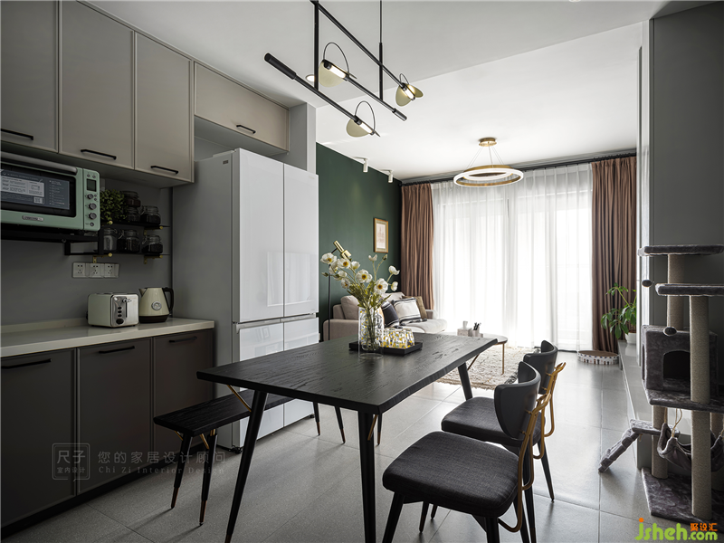 黑金配色的餐桌椅搭配著同色系后現(xiàn)代極簡個性吊燈,從橄欖綠玄關(guān)開啟的復(fù)古之旅,在餐廳空間得以延續(xù)變化。