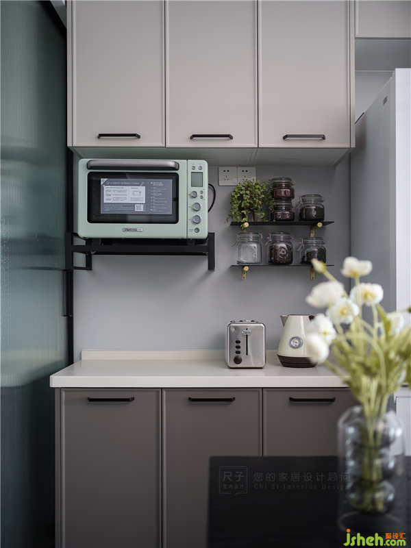 暖灰色餐邊柜上,薄荷綠電烤箱把空間從深色復(fù)古調(diào)拉入清新自然的現(xiàn)代風(fēng)世界,隔板上的瓶瓶罐罐,帶著真實溫暖的煙火氣。