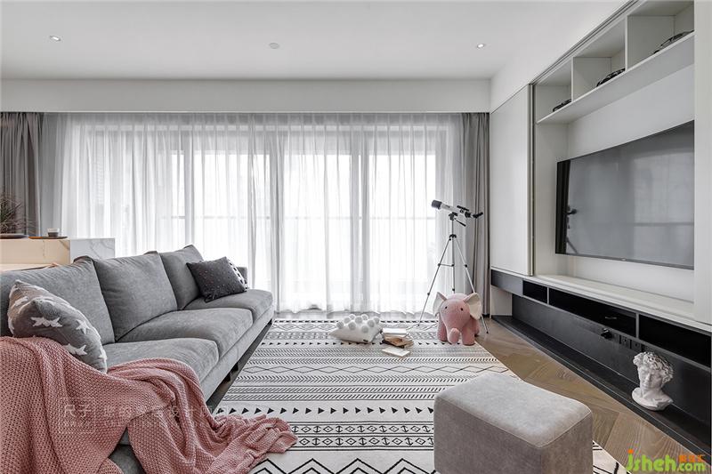客廳主要滿足實(shí)用功能,采用無主燈照明,用點(diǎn)光源進(jìn)行組合,營造出更為舒適的燈光氛圍、更為豐富的空間層次?;疑彳浀牟妓嚿嘲l(fā),搭配白色軟綿的地毯,減去茶幾后,便擁有了更多的活動(dòng)空間,給孩子一個(gè)玩樂的小天地,也便于親子之間的交流互動(dòng)。