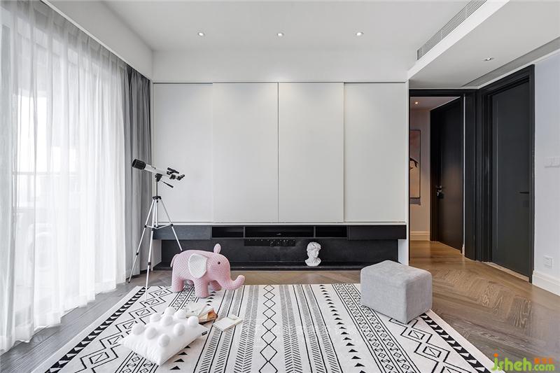 客廳電視柜和書柜結(jié)合,推拉柜門的設(shè)計(jì)可以讓電視可以藏起來,給孩子一個(gè)良好的閱讀環(huán)境。