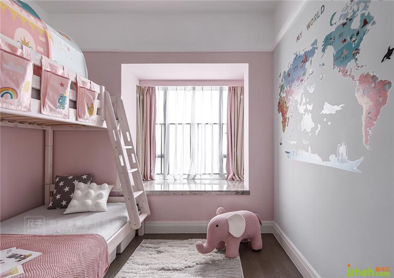 小孩房以溫柔的粉色為基調(diào),鋪上小地毯,擺上小玩具,房間充滿了童真與溫馨。右側(cè)白墻上是爸爸貼上的世界地圖貼畫,希望孩子在愛的世界里成長。
