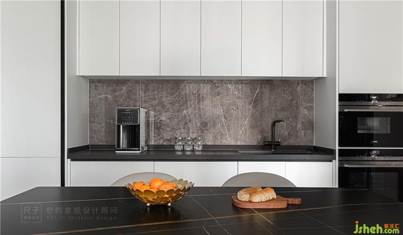 美食產(chǎn)生的地方要有美好的環(huán)境。我們利用餐邊柜作為西廚拓展烹飪空間,嵌入烤箱、冰箱等家電,以令人愉悅的美學方式整合空間,讓Z小姐能盡情在這里解鎖新的廚藝技能。理智克制的黑白灰中融入了自然的木色,讓用餐的氛圍更加溫馨。