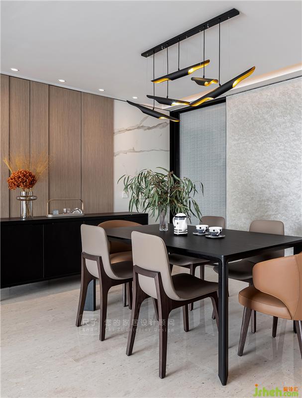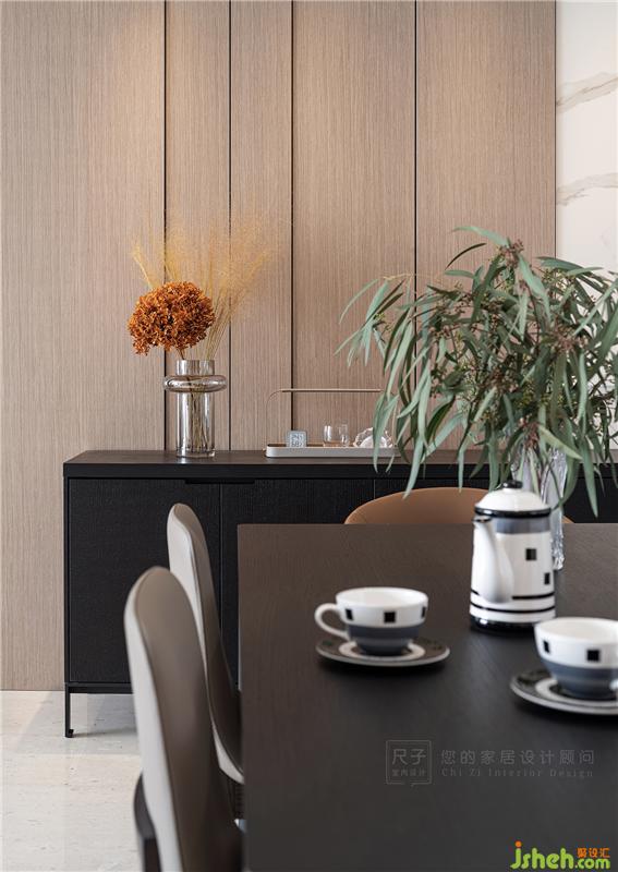 為延續(xù)空間的整體性,餐廳墻面采用了與客廳一致的材質(zhì)造型;褪去復(fù)雜的裝飾元素,高低錯落護(hù)墻板與時尚輕靈的藝術(shù)涂料,從肌理效果上呈現(xiàn)了更多細(xì)節(jié)。